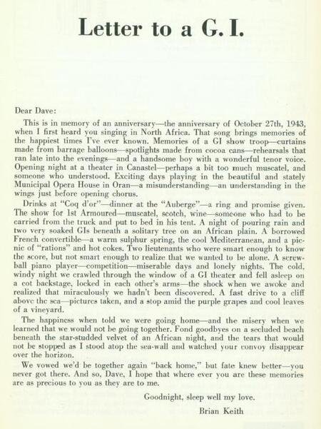 Esto es en memoria de un aniversario, el aniversario del 27 de octubre de 1943, cuando te escuché cantar por primera vez en el norte de África. Esa canción trae recuerdos de los momentos más felices que he conocido. Recuerdos de una tropa de GI show - cortinas hechas de globos de bombardeo - focos hechos de latas de cacao - ensayos que se extendieron hasta altas horas de la noche - y un chico guapo con una maravillosa voz de tenor. Noche de estreno en un teatro en Canastel, quizás demasiado moscatel, y alguien que entendió. Días emocionantes tocando en la hermosa y majestuosa Casa Municipal de Ópera en Orán - un malentendido - una reconciliacion a las justas justo antes de abrir el coro.